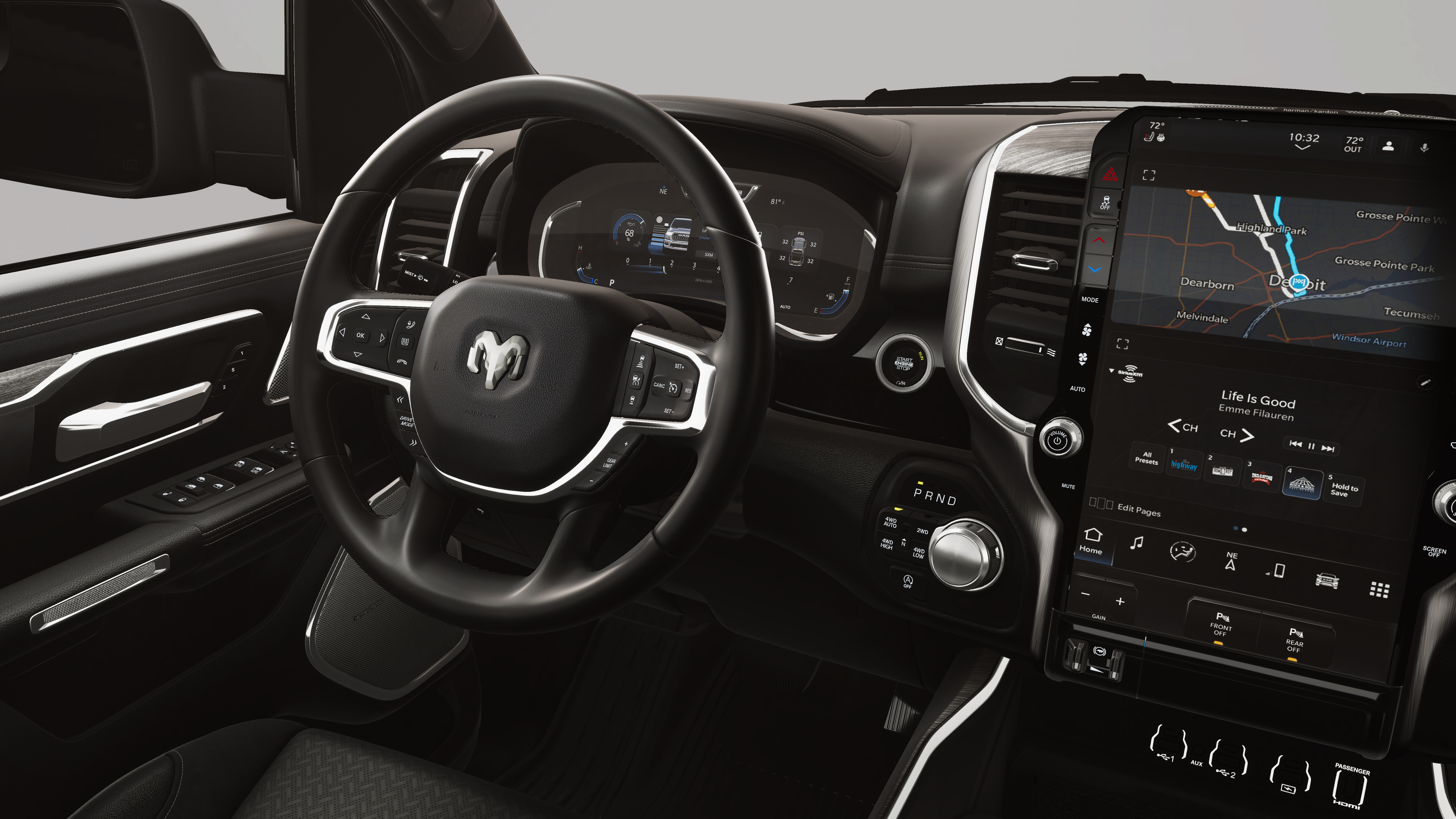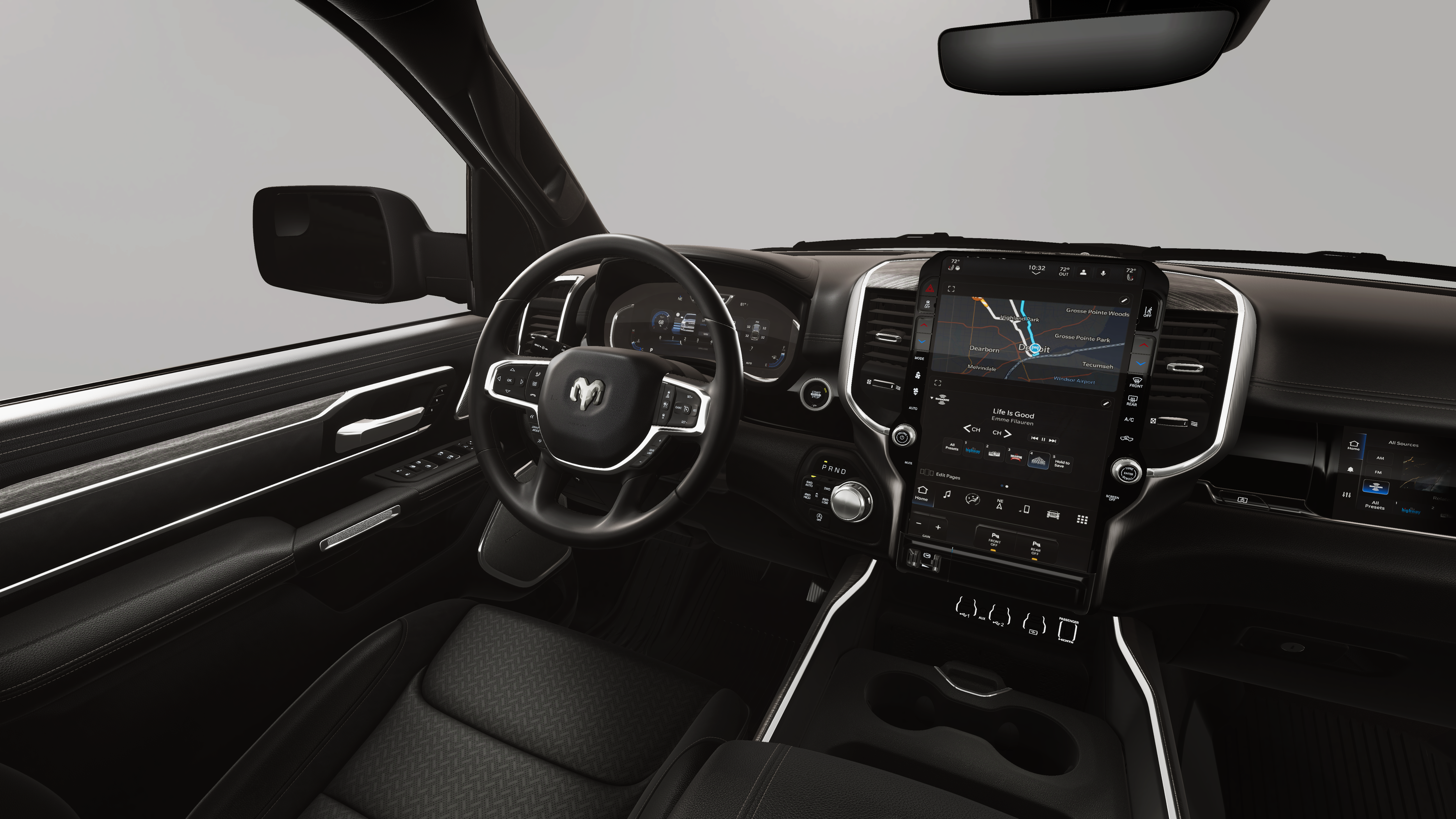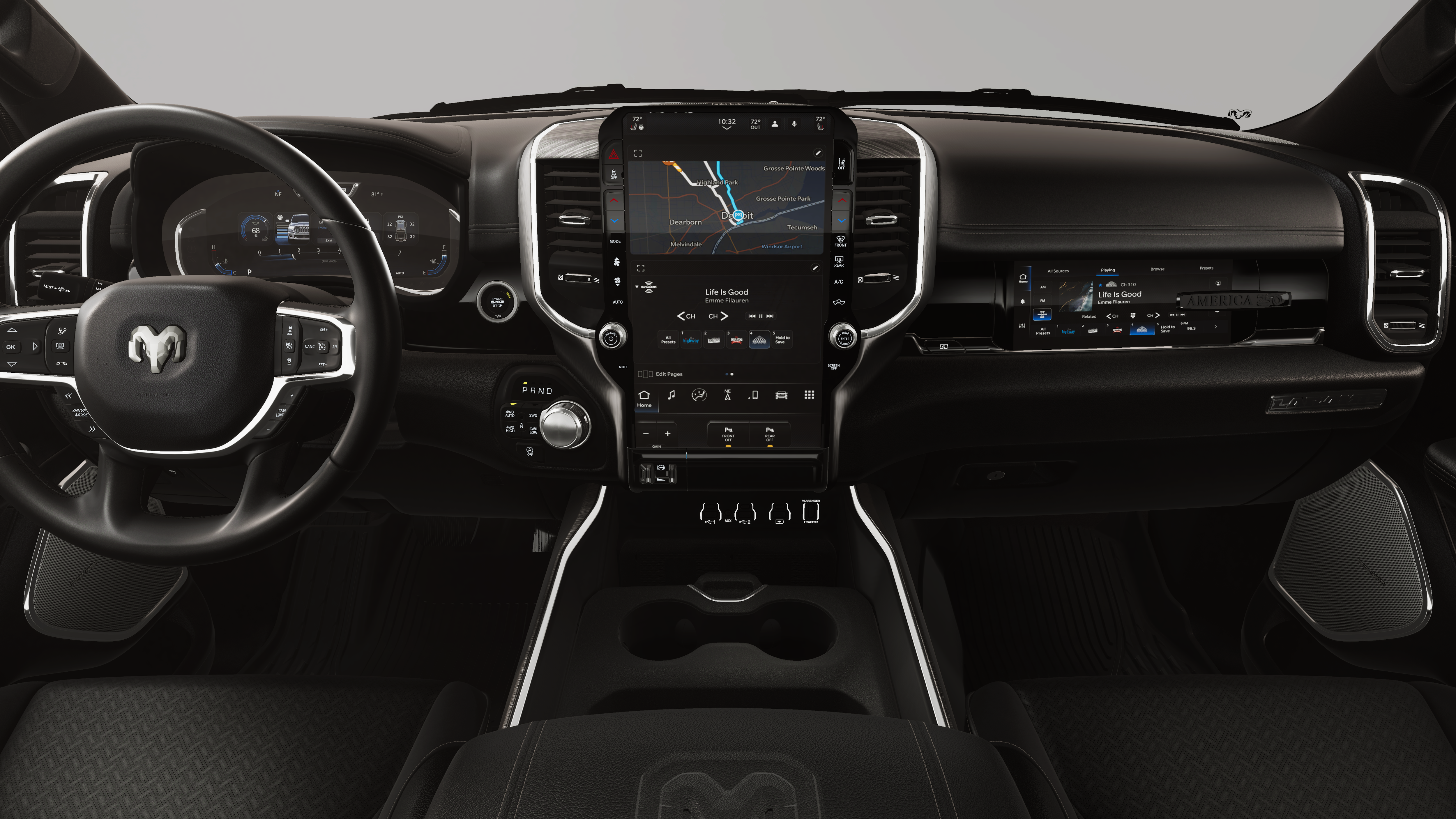 Granite 2026 Ram 1500 Laramie 4WD 8-Speed Automatic HEMI 5.7L V8 Multi Displacement VVT eTorque 10 Speakers, 14.4 Touchscreen Display, 4-Wheel Disc Brakes, 48V Belt Starter Generator, 4G LTE Wi-Fi Hot Spot, ABS brakes, Accent Color Door Handles, Accent Color Premium Power Mirrors, Accent Color Tailgate Handle, Active Noise Control System, Adjustable pedals, Air Conditioning, Alloy wheels, AM/FM radio: SiriusXM with 360L, Anti-Spin Differential Rear Axle, Apple CarPlay/Android Auto, Audio memory, Auto High-beam Headlights, Auto Power-Folding Mirrors, Auto-dimming door mirrors, Auto-Dimming Exterior Driver Mirror, Auto-dimming Rear-View mirror, Automatic temperature control, Black Exterior Truck Badging, Black Headlamp Bezels, Black Interior Accents, Black Painted Exterior Mirrors Caps, Black Tail Lamp Bezels, Body Color Front Bumper, Body Color Rear Bumper with Step Pads, Brake assist, Bumpers: chrome, Chrome Exterior Mirrors, Cluster 12 TFT Color Display, Compass, Connected Travel and Traffic Services, Connectivity - US/Canada, Convex Wide-Angle Exterior Mirror Insert, Delay-off headlights, Delete Alternator, Dome Dual LED Reading Lamp, Driver door bin, Driver vanity mirror, Dual Exhaust with Black Tips, Dual front impact airbags, Dual front side impact airbags, Dual-Pane Panoramic Sunroof, Electronic Stability Control, Exterior Mirrors Approach Lamps, Exterior Mirrors Courtesy Lamps, Exterior Mirrors with Heating Element, Exterior Mirrors with Memory, Exterior Mirrors with Supplemental Signals, Front anti-roll bar, Front Bucket Seats, Front Center Armrest w/Storage, Front dual zone A/C, Front fog lights, Front Passenger Interactive Display, Front reading lights, Front wheel independent suspension, Fully automatic headlights, Garage door transmitter, GPS Navigation, Grille Surround 3 Black Texture 2 Black, Harman/Kardon 19 Speaker Premium Sound, Heated door mirrors, Heated front seats, Heated rear seats, Heated steering wheel, Heavy-Duty Engine Cooling, Illuminated entry, Integrated Center Stack Radio, Integrated Voice Command with Bluetooth®, Laramie Level 2 Equipment Group, Leather steering wheel, Leather Trimmed Bucket Seats, LED Dome/Reading Lamp, Low tire pressure warning, Manufacturer's Statement of Origin, Memory seat, Mopar Black Tubular Side Steps, MOPAR Front and Rear Rubber Floor Mats, Navigation System, Night Edition, Occupant sensing airbag, Off-Road Information Pages, Outside temperature display, Overhead airbag, Overhead console, Panic alarm, ParkView Rear Back-Up Camera, Passenger door bin, Passenger vanity mirror, Passive Cold End Exhaust, Passive Tuned Mass Damper, Pedal memory, Pirelli Brand Tires, Power door mirrors, Power driver seat, Power passenger seat, Power steering, Power Tailgate, Power windows, Proximity Approach/Departure Lamps, Quick Order Package 27H Laramie, Radio data system, Radio: Uconnect 5 Nav with 14.4 Display, Radio: Uconnect 5 Navigation with 12.0 Display, Rain Sensitive Windshield Wipers, RAM Grille Badge - Black, RAM Grille Badge - Chrome, Rear anti-roll bar, Rear reading lights, Rear seat center armrest, Rear step bumper, Rear Wheelhouse Liners, Remote keyless entry, Security system, SiriusXM Radio Service, SiriusXM with 360L, Speed control, Split folding rear seat, Sport Performance Hood, Steering wheel mounted audio controls, Tachometer, Telescoping steering wheel, Tilt steering wheel, Traction control, Trailer Brake Control, Trip computer, Turn signal indicator mirrors, USB Host Flip, Variably intermittent wipers, Ventilated front seats, Voltmeter, Wheels: 20 x 9 Premium Paint/Polish, Wheels: 22 x 9 Forged Aluminum.